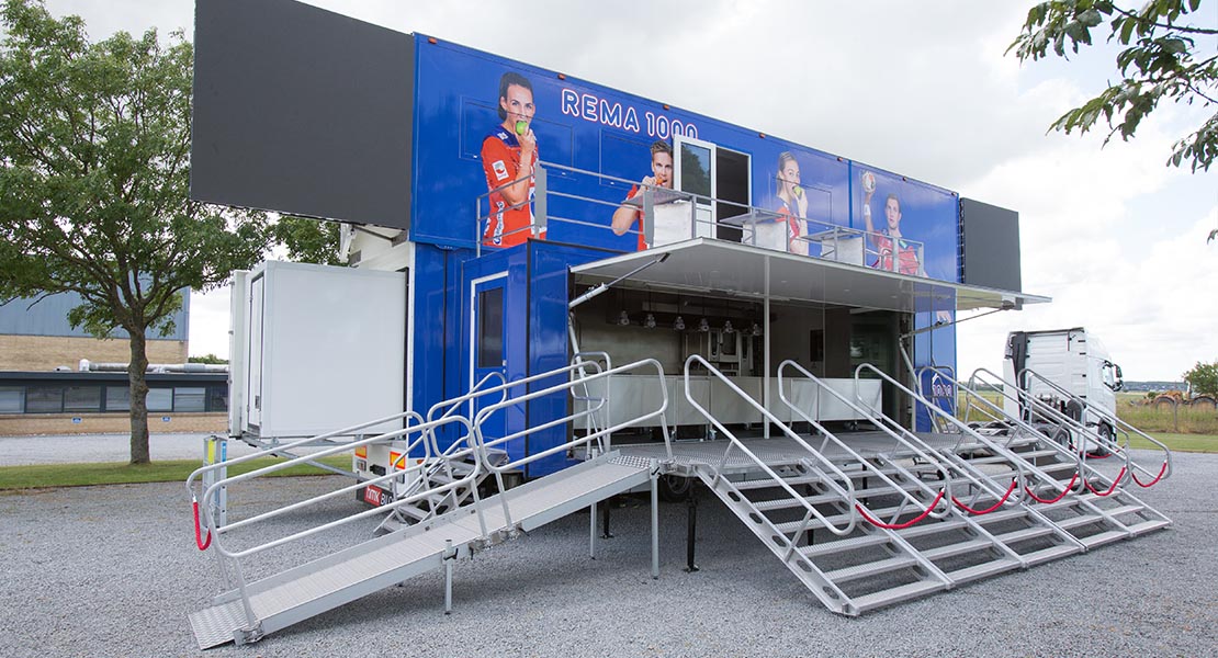 HMK Bilcon har leveret en specialbygget mobil restaurant til Rema 1000 i Norge. Den er bygget som en HMK Bilcon Multispace XL trailer med åbenbar side i udskud og med topskud. Premiere ved Norway Cu...